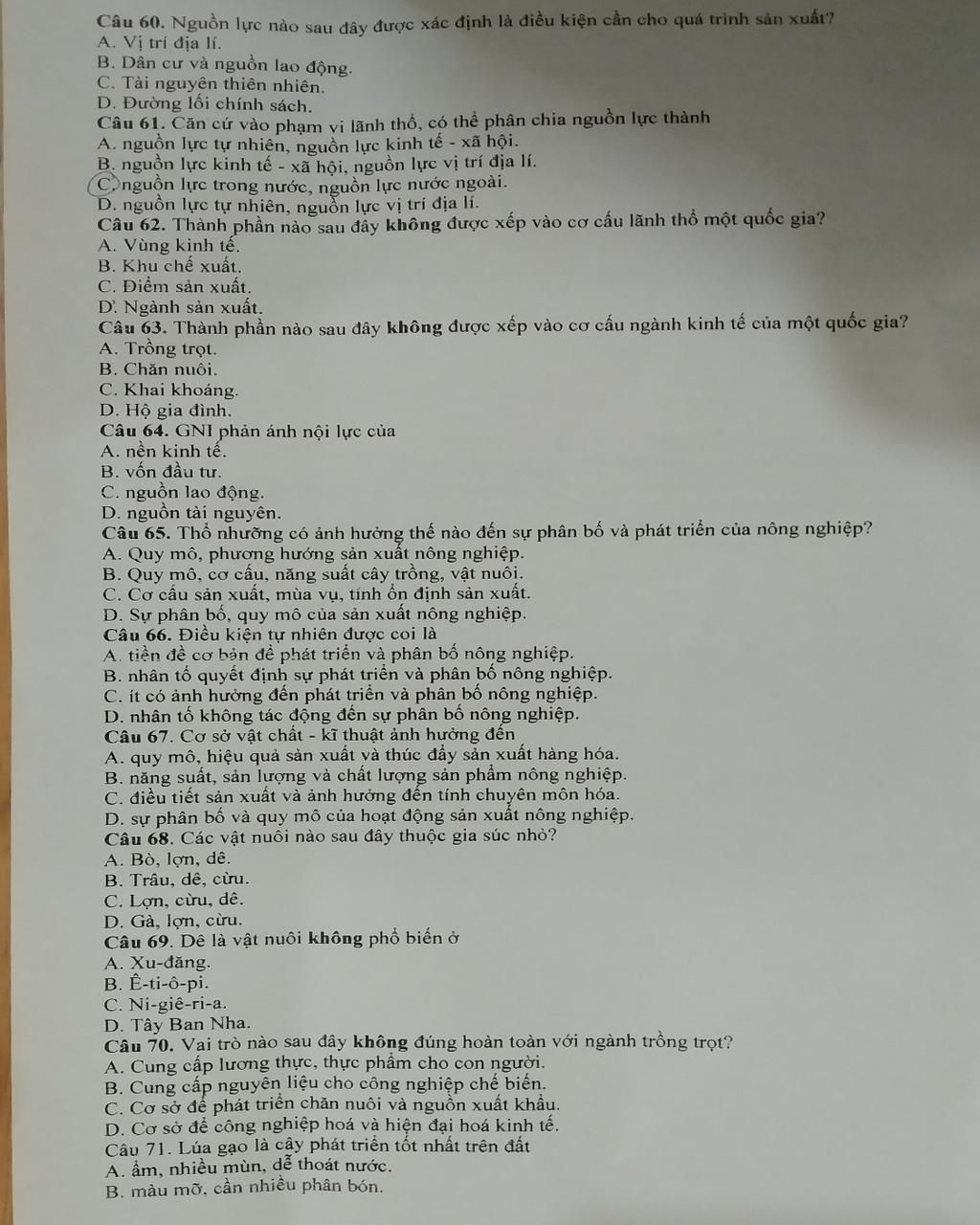 Câu 61. Căn cứ vào phạm vi lãnh thổ, có thể phân chia nguồn lực thành
