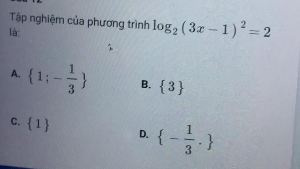 `\log_2(3x-1)^2=2 ⇔ (3x-1)^2=2^2 ⇔ 9x^2-6x+1-4=0`