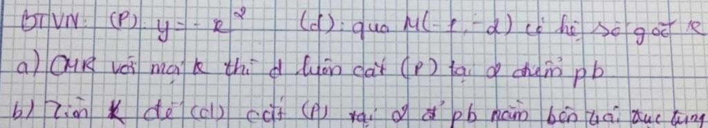 Vậy với `k>2` thì `(d)` cắt `(P)` tại hai điểm phân biệt nằm bên trái trục tung