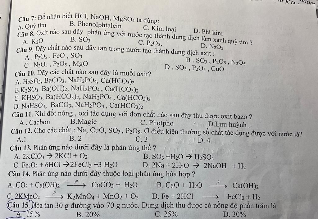 Câu 9: Dãy chất tan trong nước và tạo thành dung dịch axit :