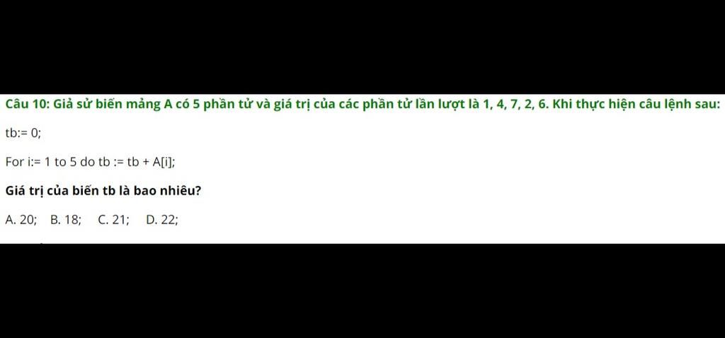 Câu 10: Giả sử biến mảng A có 5 phần tử và giá trị của các phần tử lần lượt là 1, 4, 7, 2, 6. Khi thực hiện câu lệnh sau: