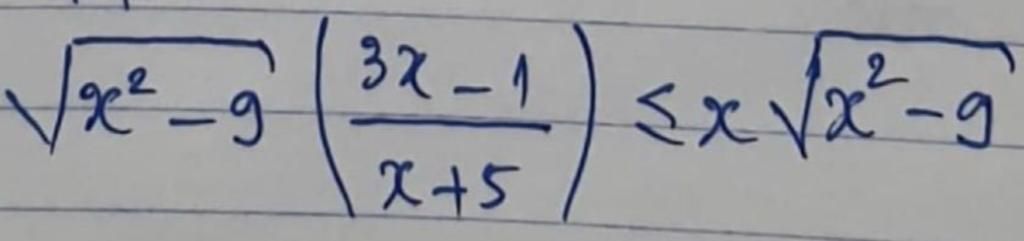 `\qquad \sqrt{x^2-9}. {3x-1}/{x+5}\le x\sqrt{x^2-9}` `(1)`
