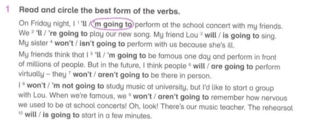 1. We 'll/'re going to play our new song. My friend Lou will / is going to sing.