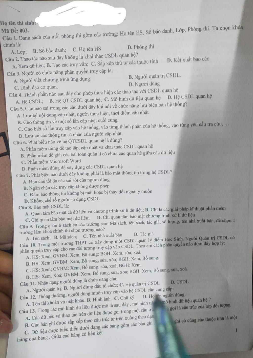 Câu 1. Danh sách của mỗi phòng thi gồm các trường: Họ tên HS, Số báo danh, Lớp, Phòng thi. Ta chọn khóa