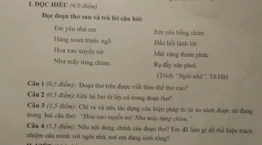 Câu 1: Đoạn thơ trên được viết theo thể thơ 4 chữ