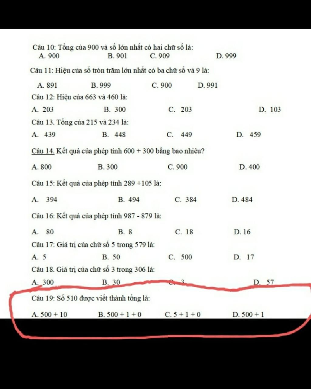 Câu 10: Tổng của 900 và số lớn nhất có hai chữ số là:
