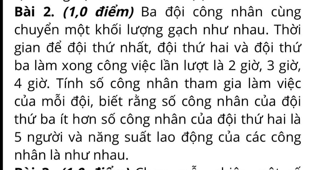 + Vì số công nhân tham gia làm việc và thời gian hoàn thanh công việc của mỗi đội là hai đại lượng tỉ lệ nghịch nên ta có: (phần đổi phân số bn làm như trong ảnh nha)
