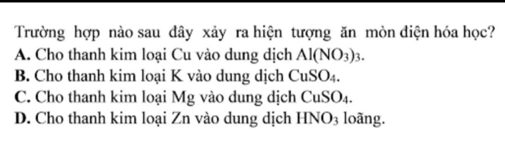 `-` Mà trong các đáp án chỉ có $C.$ là có $Mg$ đẩy $CuSO_4$ tạo thành điện cực $Mg$ và $Cu$
