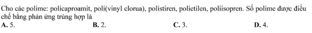 - Số polime được điều chế bằng phản ứng trùng hợp: poli (vinyl clorua), polistiren, polietilen, poliisopren.