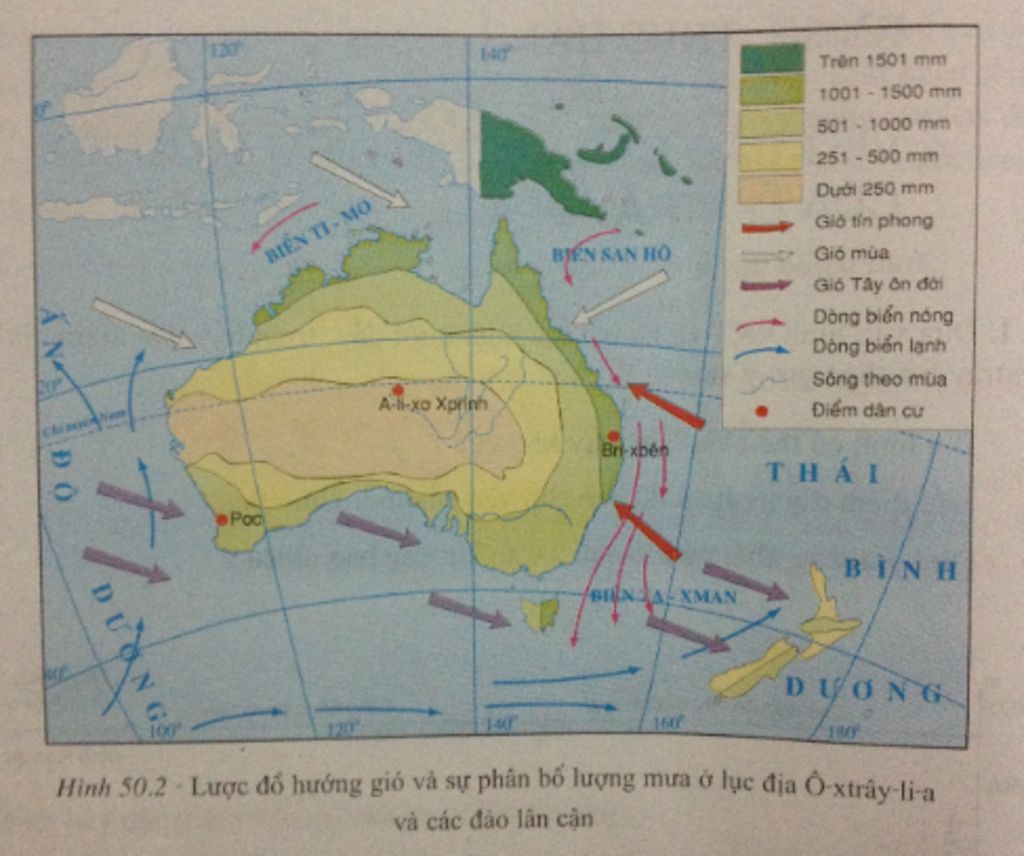 + Chí tuyến Nam đi qua giữa lục địa nên phần lớn lãnh thổ Australia nằm trong khu vực áp cao chí tuyến, không khí ổn định khó gây mưa