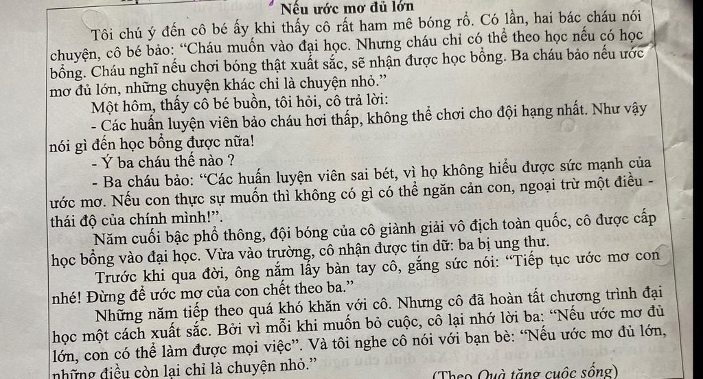 Câu 1 :Ước mơ đủ lớn là một ước mơ có ý nghĩa, mang lại hạnh phúc lớn lao cho bản thân mình và người khác, đồng thời phải là ước mơ mà chúng ta phấn đấu không ngừng nghỉ, cố gắng hết mình, vượt qua mọi khó khăn trong cuộc sống để đạt được thành tựu to lớn cho đời.
