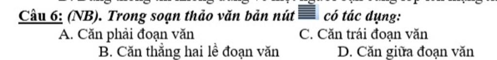 `\text{Trong soạn thảo văn bản nút đó có tác dụng là căn thẳng 2 lề đoạn văn.}`