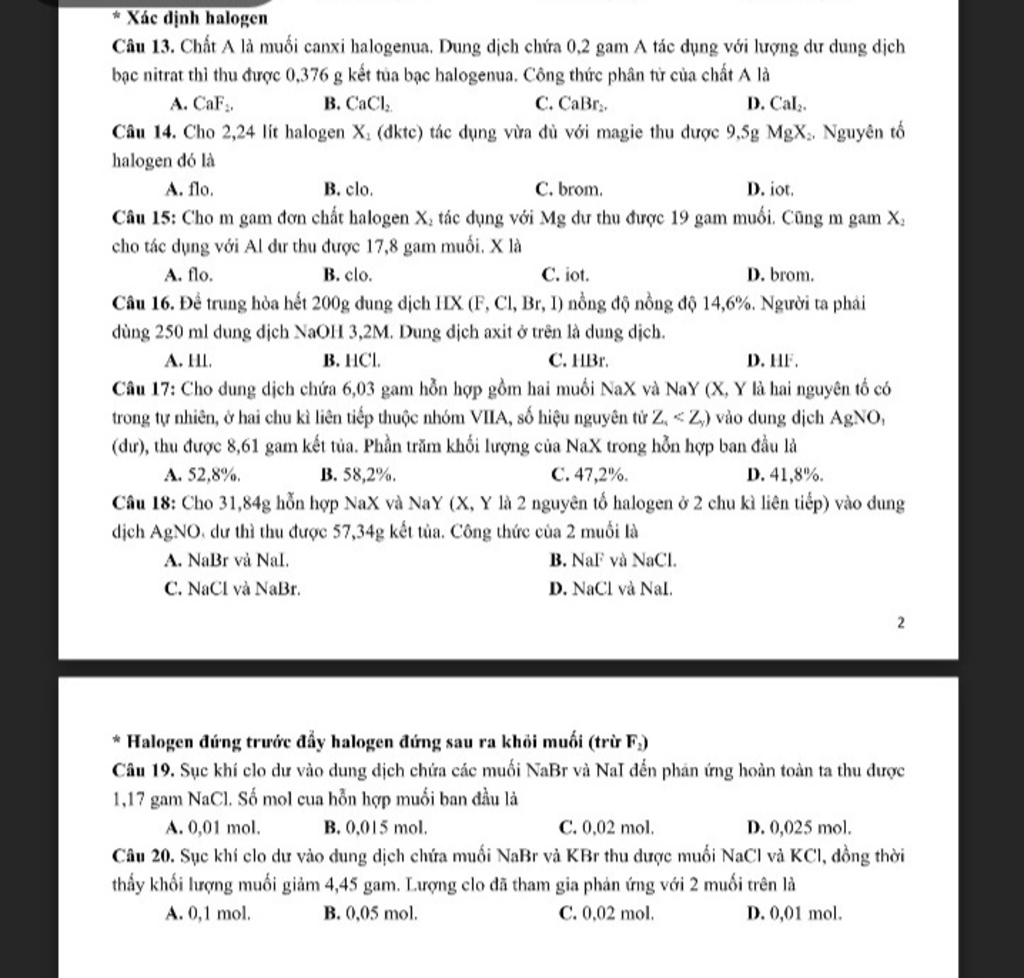 Câu 13. Chất A là muối canxi halogenua. Dung dịch chứa 0,2 gam A tác dụng với lượng du dung dịch