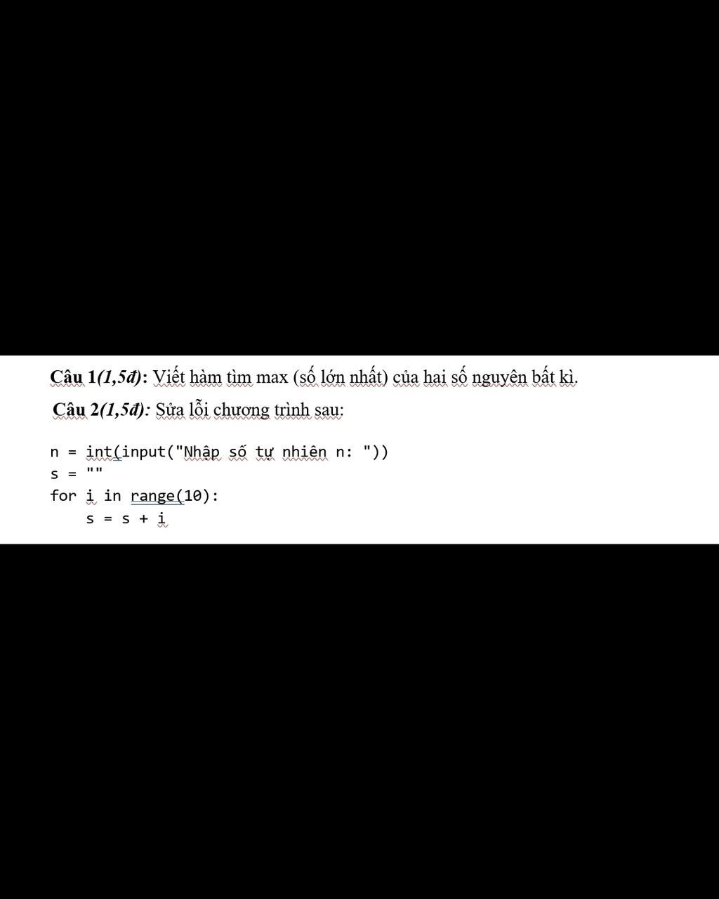 Câu 1: Ta sẽ viết hàm max, trong hàm max này sẽ trả về biến có giá trị lớn hơn.