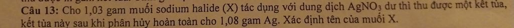 $\begin{array}{l} X: NaR\\ NaR+AgNO_3\to AgR+NaNO_3\\ AgR\to Ag+R_2\\ n_{Ag}=\dfrac{1,08}{108}=0,01(mol)\\ n_{NaR}=n_{AgR}=n_{Ag}=0,01(mol)\\ M_{NaR}=\dfrac{1,03}{0,01}=103(g/mol)\\ \to M_R=103-23=80(g/mol)\\ R: Bromide\ (Br)\\ X: NaBr\end{array}$