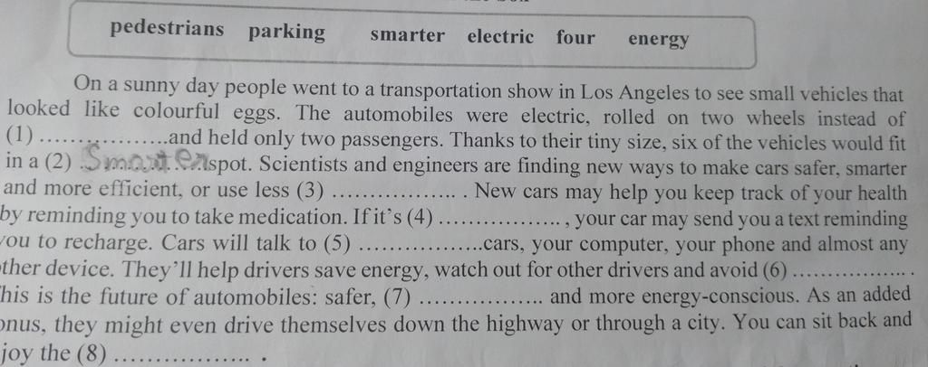 looked like colourful eggs. The automobiles were electric, rolled on two wheels instead of
