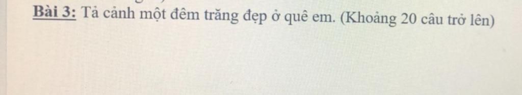 Hoàng hôn vừa tắt Cũng là lúc Màn đêm buông xuống. Bóng đêm bao trùm Vạn Vật tất cả chỉ là những hình thù kỳ lạ. Anh đom đóm đã xuất hiện từ khi nào lập lòe Sáng. Trong làng mọi nhà cũng lên đèn. Một hồi sau từ phía chân trời bên kia bóng trăng lấp ló sao lũy tre làng tỏa ánh sáng non nước rồi từ từ nhô lên khỏi mái nhà ngọn cây. Chao ôi Trăng Đêm nay mới đẹp làm sao! Mặt trăng tròn vảnh vạnh to và ửng đỏ như một chiếc đèn lồng tôi có cảm giác nhìn rõ Chú Cuội ngồi gốc cây đa. Mặt Trăng hiền hòa Phải chăng vì thế mà người ta gọi trăng là chị Hằng? Trân châu lên lửng trên không trung và bồng bềnh trôi trên nền trời xanh thẳm tỏa ánh sáng dịu dịu xóa mờ ánh lên. Ánh trăng len lỏi trong các cành cây. Ánh trăng Tinh Nghịch trốn mẹ đi chơi lên nói qua cái lá nhảy xuống sân gạch nô đùa tạo nên một bức tranh đẹp tuyệt vời với môn ngàn vẩy vàng vậy bạc lấp lánh. Ánh trăng lung linh trên bầu trời soi xuống dưới đáy nước để làm duyên làm cho mọi Cảnh vật đêm trăng thêm êm đềm và tĩnh mịch. Và lúc ấy trăng đã lên cao hơn Quê Hương Em Dịu Dịu Nhuộm vàng khắp ruộng đồng thôn xóm. Trang nhảy nhót trên cánh đồng bông lúa rì rào rẫy chào Ánh Trăng. Trong ùa vào vườn cây nhưng đầu trên cây đa đầu làng thì thầm trò chuyện. Dòng sông trong xanh cũng vì trăng mà mơ màng thao thức lặng lẽ trôi về phía xa. Bãi cỏ non bên kia sông cũng rực rỡ như tấm Nhung xanh Dưới Trăng. Càng lên cao Trăng càng sáng tỏ hàng cây ngập trong ánh trăng con đường như được khoác trên mình một tấm nền hoa. Trang nhè nhẹ bước đến từng nhà Trang mỉm cười với các cụ già trang dịu dàng với tuổi thơ. Đâu đó Quê Hương Em vọng lại tiếng reo Hò của bọn trẻ hòa cùng với tiếng côn trùng kêu ra trả phá tan bầu không khí yên lặng của đêm trăng. Càng về khuya trông càn tổ và sáng lành thêm lặng lẽ cảnh vật như đang chìm vào ngủ dưới ánh trăng chan hòa của quê hương em