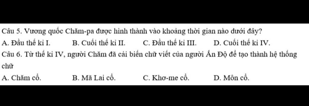 Câu 5. Vương quốc Chăm-pa được hình thành vào khoảng thời gian nào dưới đây?