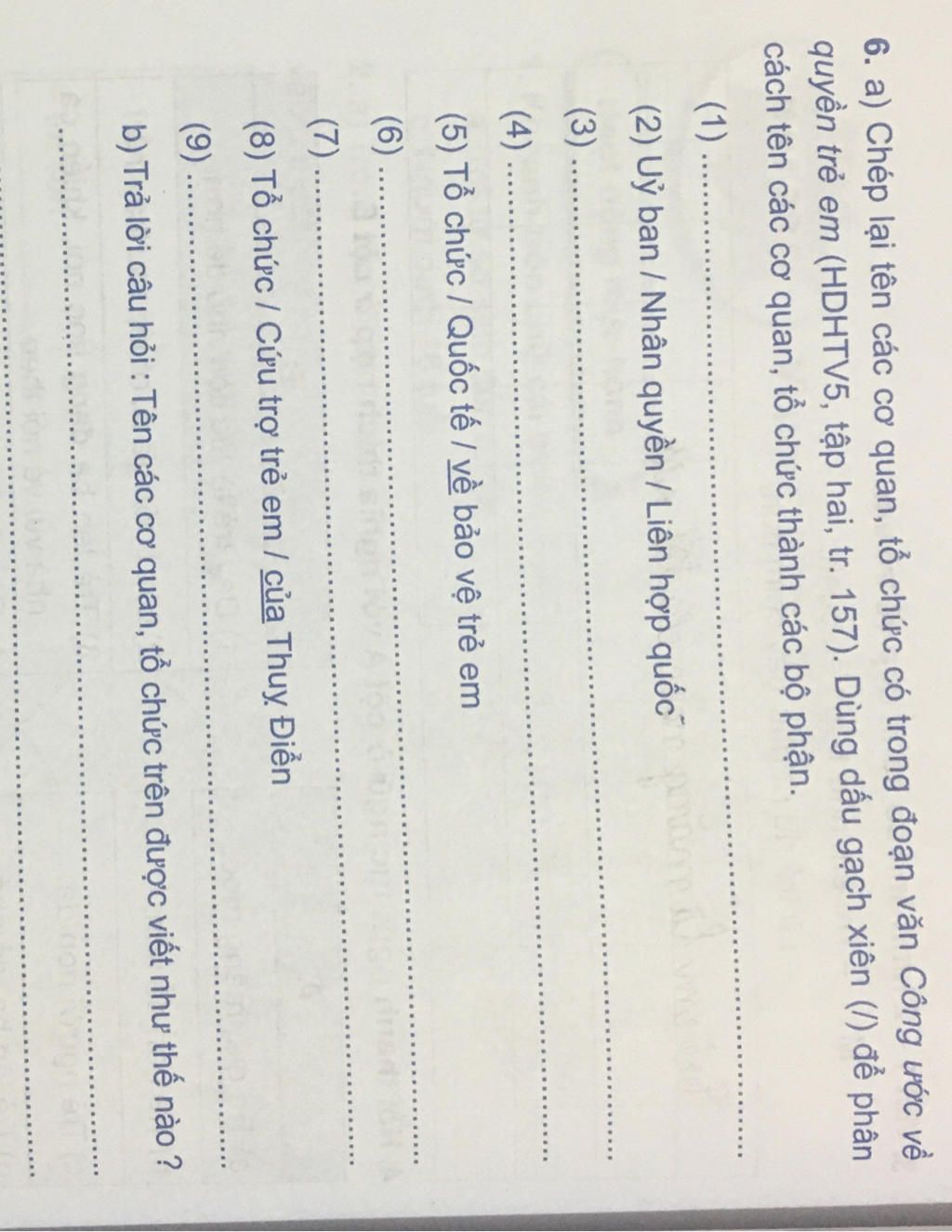 5.Tổ chức Quốc tế về bảo vệ trẻ em (có 3 bộ phận: Tổ chức/ Quốc tế/ về bảo vệ trẻ em)