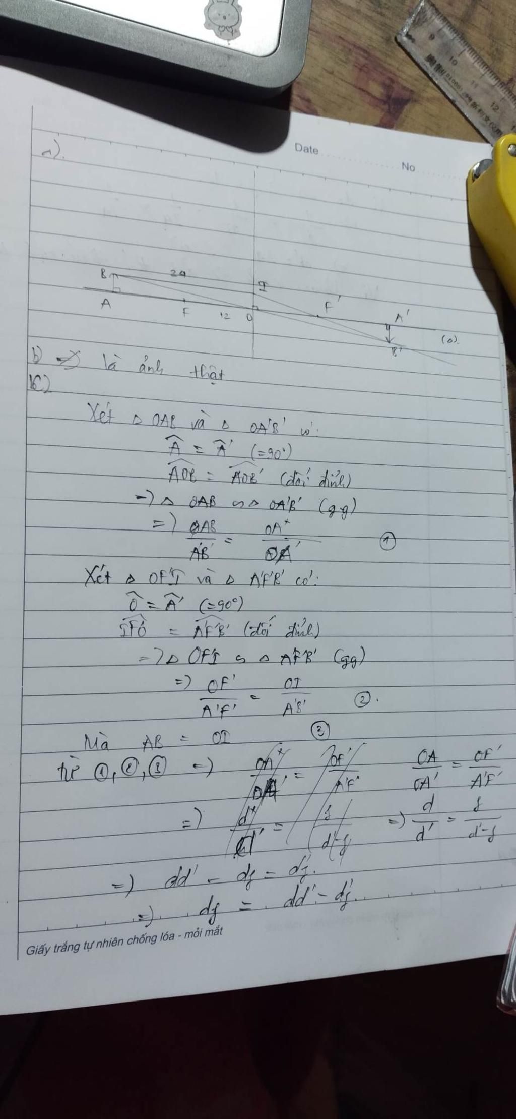 \dfrac{{AB}}{{A'B'}} = \dfrac{{OI}}{{A'B'}} = \dfrac{{OF}}{{ - OA' + OF}} = \dfrac{{12}}{{12 - OA'}}\\