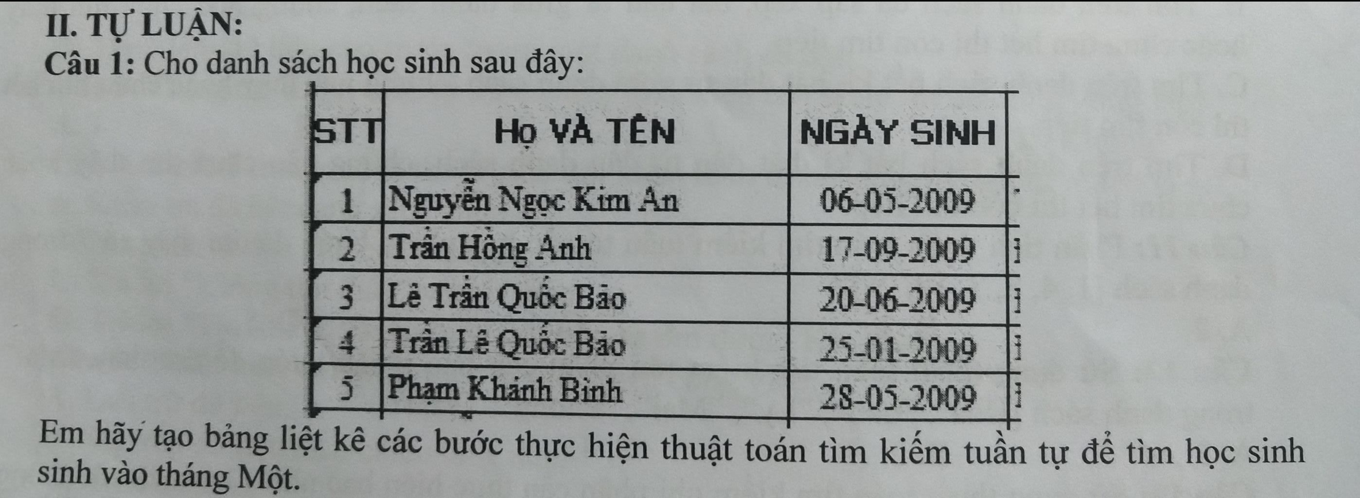 Câu 1: Cho danh sách học sinh sau đây:
