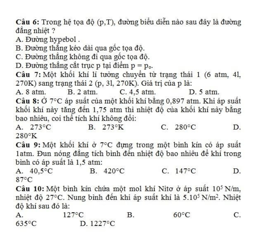 \(\dfrac{{{p_1}{V_1}}}{{{T_1}}} = \dfrac{{{p_2}{V_2}}}{{{T_2}}} \Rightarrow \dfrac{{6.4}}{{270}} = \dfrac{{p.3}}{{270}} \Rightarrow p = 8atm\)