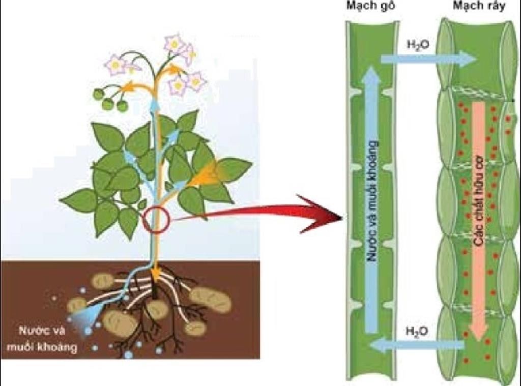 -Dòng mạch gỗ (dòng đi lên): vận chuyển nước và ion khoáng từ đất vào mạch gỗ của rễ và tiếp tục dâng lên theo mạch gỗ trong thân để lan tỏa đến lá và các phần khác của cây.