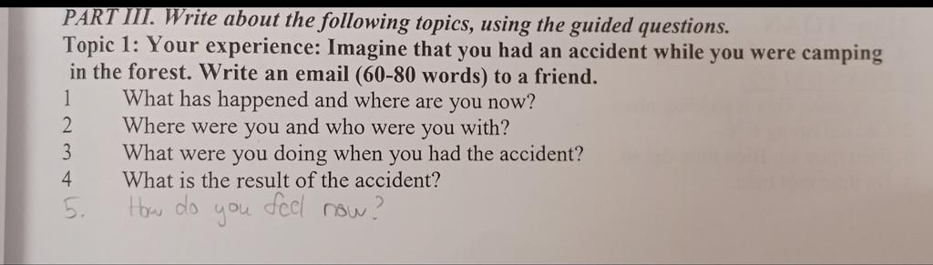 Topic 1: Your experience: Imagine that you had an accident while you were camping