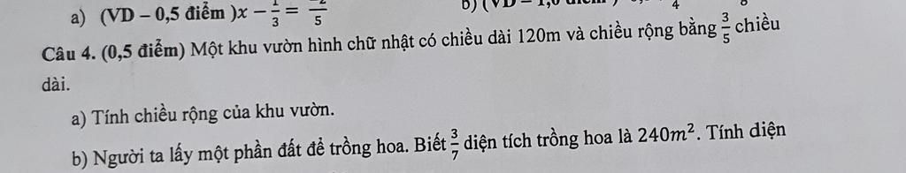 Câu 4. (0,5 điểm) Một khu vườn hình chữ nhật có chiều dài 120m và chiều rộng bằng chiều