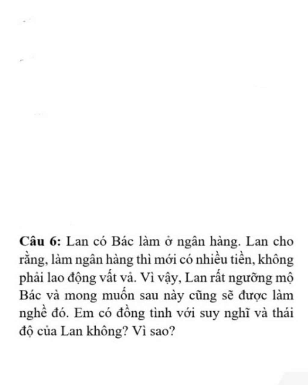 Em không thể đồng tình với suy nghĩ và thái độ của Lan vì đó là một suy nghĩ sai lầm. Làm ngân hàng không phải là một công việc chỉ đơn giản là ngồi một chỗ và không lao động vất vả. Công việc này yêu cầu kiến thức chuyên môn cao và kỹ năng quản lý tài chính, đồng thời cũng cần phải làm việc với khách hàng, đối tác và những bên liên quan khác, đòi hỏi sự chăm chỉ, kiên trì và trách nhiệm cao. Ngoài ra, cũng cần phải đối mặt với rủi ro và áp lực trong công việc. Do đó, cần phải xem xét kỹ trước khi quyết định lựa chọn nghề nghiệp, không nên đơn giản hóa và lãng quên những khó khăn mà một công việc mang lại