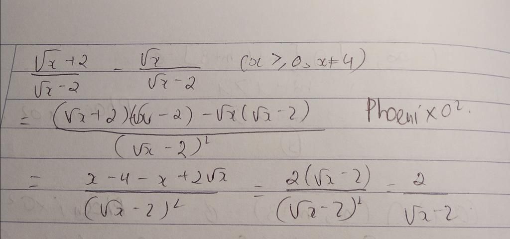 \dfrac{{\sqrt x + 2}}{{\sqrt x - 2}} - \dfrac{{\sqrt x }}{{\sqrt x - 2}}\\