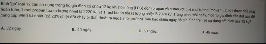 Lượng nhiệt đốt cháy 12 kg khí hoá lỏng:
