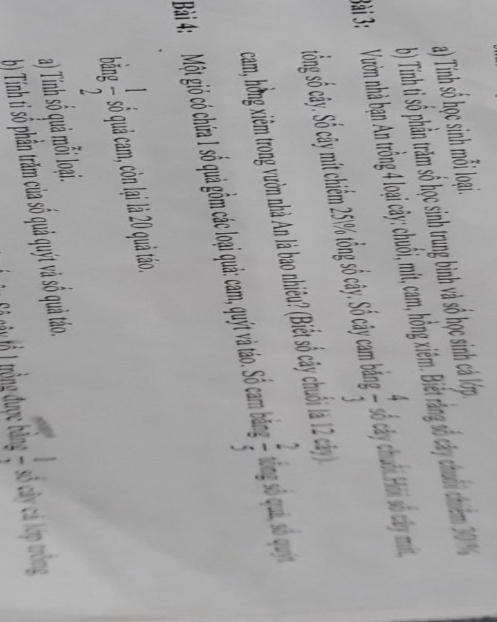 Bài 3: Vườn nhà bạn An trống 4 loại cây: chuối, mít, cam, hồng xiêm. Biết rằng số cây chuối chiếm 30%