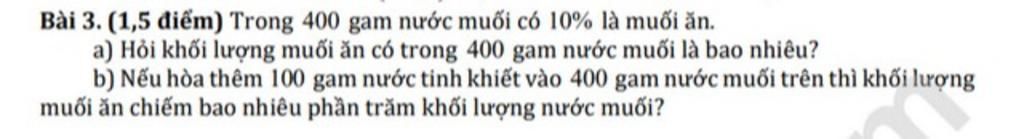 b) Nếu hòa thêm 100 gam nước tinh khiết vào 400 gam nước muối trên thì khối lượng muối ăn chiếm số phần trăm khối lượng nước muối là: