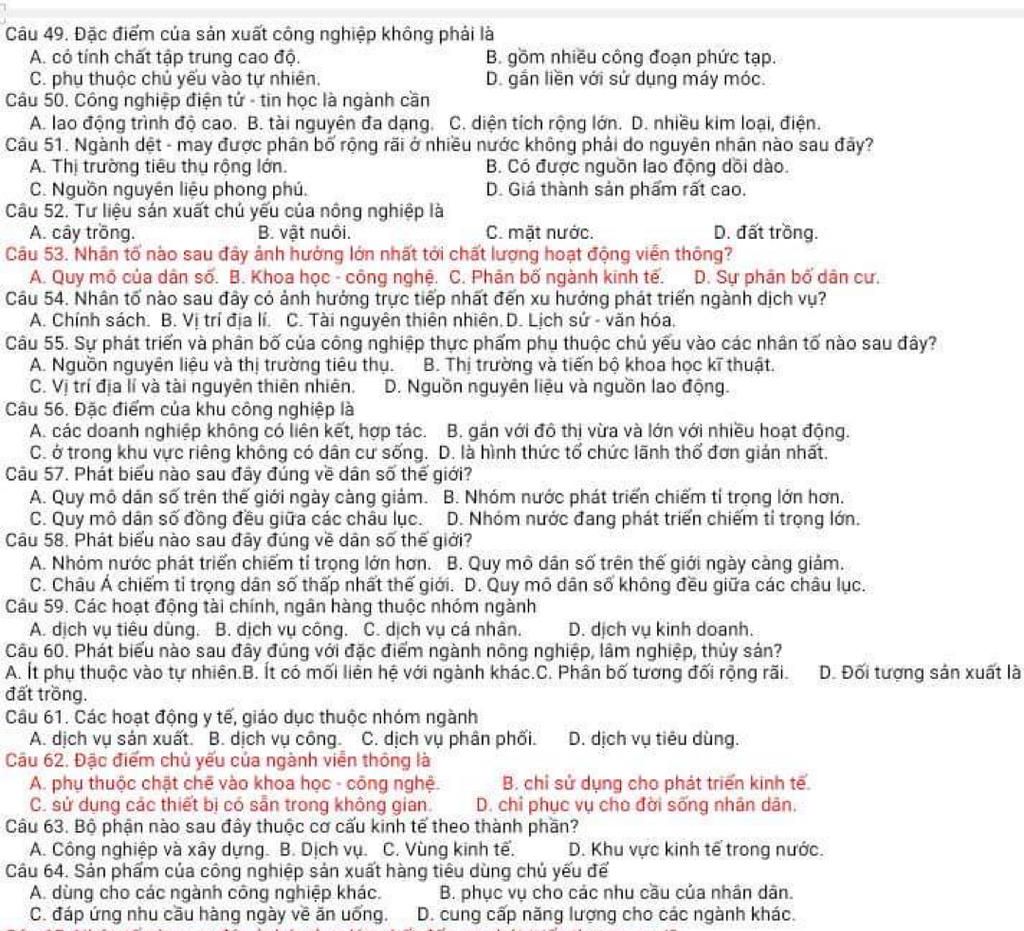 Câu 49. Đặc điểm của sản xuất công nghiệp không phải là
