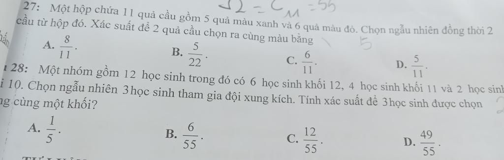28D mà do không cùng một khối $1-\dfrac{6C3+4C3}{12C3}=\dfrac{49}{55}$ Mà nếu cùng một khối thì $n(\Omega)=10C3$??