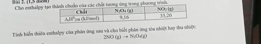 \to Delta_rH_{298}^0=\Delta_fH_{298}^0(N_2O_4)-2.\Delta_fH_{298}^0(NO_2)=9,16-2.33,2=-57,24(kJ)