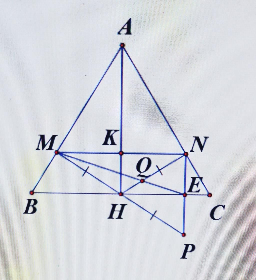 c/ Trên tia đối của tia HM lấy P sao cho H là trung điểm của MP, NP cắt BC tại E, NH cắt ME tại Q. Chứng minh: P, Q, K thẳng hàng.