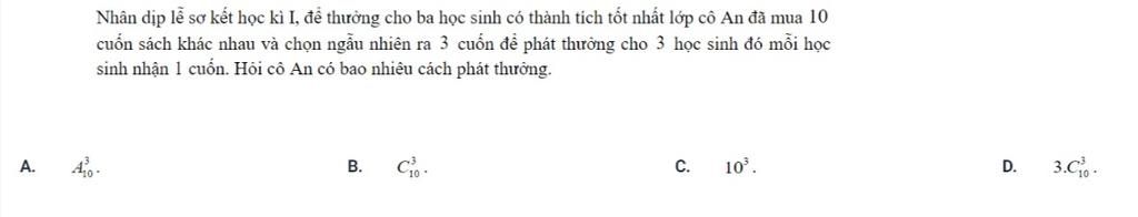 - Số cách phát thưởng cho mỗi bạn bằng cách lấy 3 quyển từ 10 quyển là một chỉnh hợp chập 3 của 10