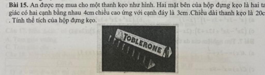Bài 15. An được mẹ mua cho một thanh kẹo như hình. Hai mặt bên của hộp đựng kẹo là hai tam giác có hai cạnh bằng nhau 4cm chiều cao ứng với cạnh đáy là 3cm .Chiều dài thanh kẹo là 20cm . Tính thể tích của hộp đựng kẹo.