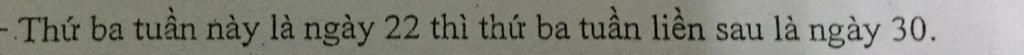 Thứ 3 tuần này là ngày 22 thì thứ 3 tuần liền sau là ngày 30.