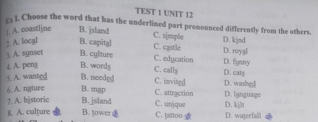 1. A. coastline/ɪ/ B.island/ɪ/ C.simple/i/ D. kind/ɪ/