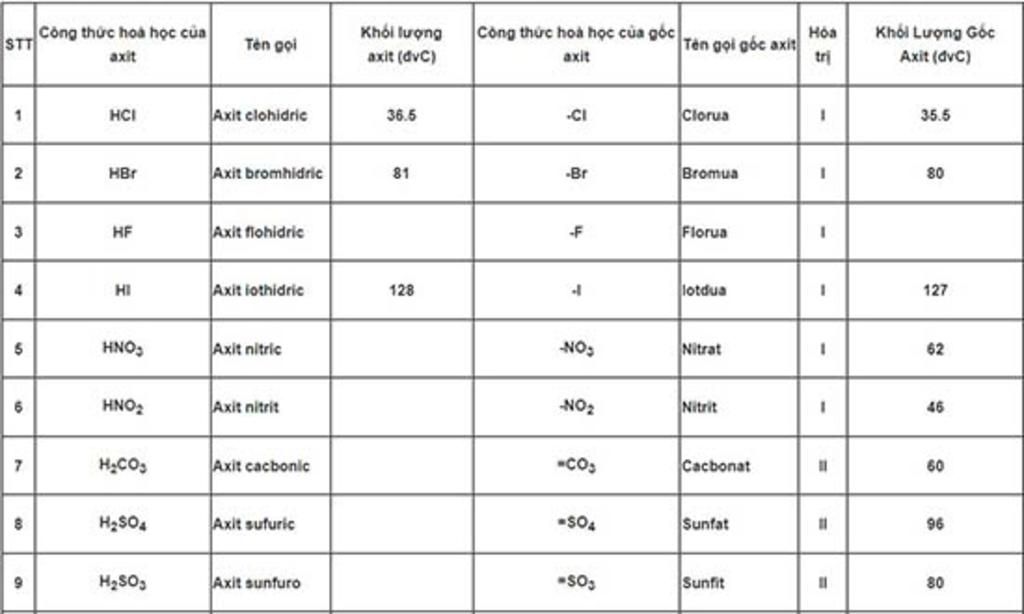 (Bảng gốc acid thì cậu tham khảo bảng phía dưới nhé).