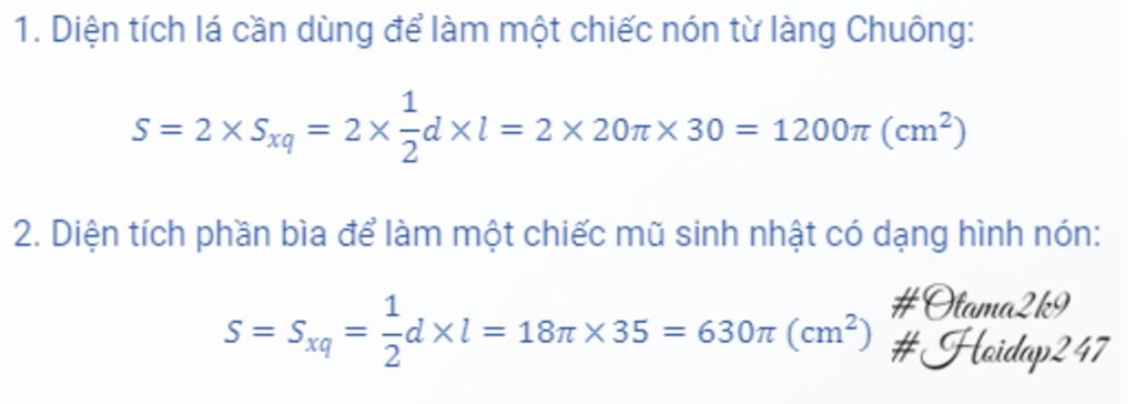 $\text{Vậy diện tích phần bìa để làm một chiếc mũ nói trên là 630$\pi$ cm².}$