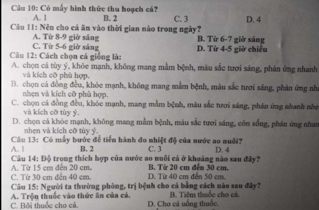 Câu 10: Có mấy hình thức thu hoạch cá?