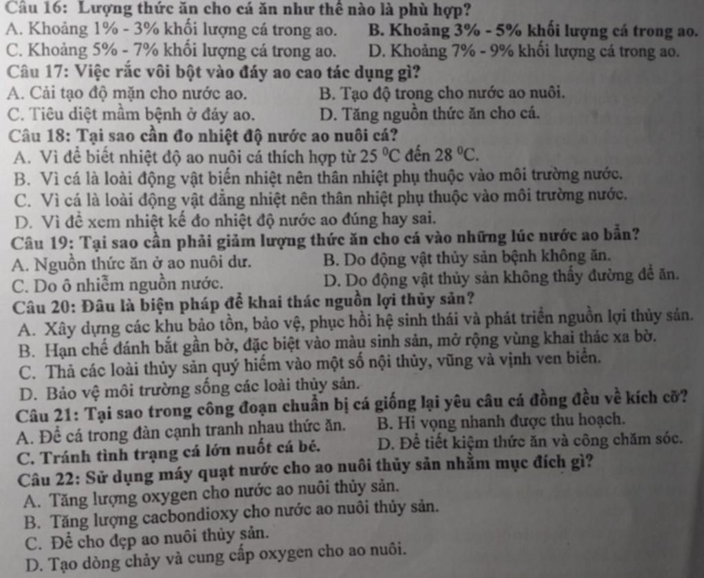 Câu 17: Việc rắc vôi bột vào đáy ao cao tác dụng gì?