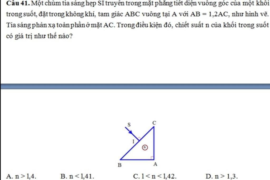 Tia sáng phản xạ toàn phần ở mặt AC. Trong điều kiện đó, chiết suất n của khối trong suốt