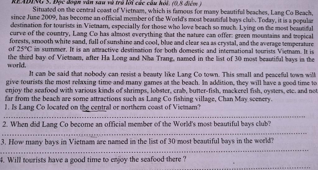 `-` Dẫn chứng: Situated on the central coast of Vietnam, which is famous for many beautiful beaches, Lang Co Beach, since June 2009, has become an official member of the World's most beautiful bays club.