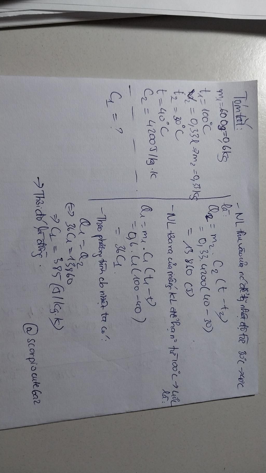 \({c_2} = \dfrac{Q}{{{m_2}\left( {{t_2} - t} \right)}} = \dfrac{{13860}}{{0,6\left( {100 - 40} \right)}} = 385\left( {J/kgK} \right)\)