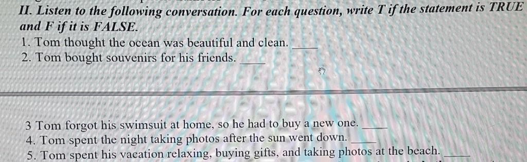 II. Listen to the following conversation. For each question, write T if the statement is TRUE